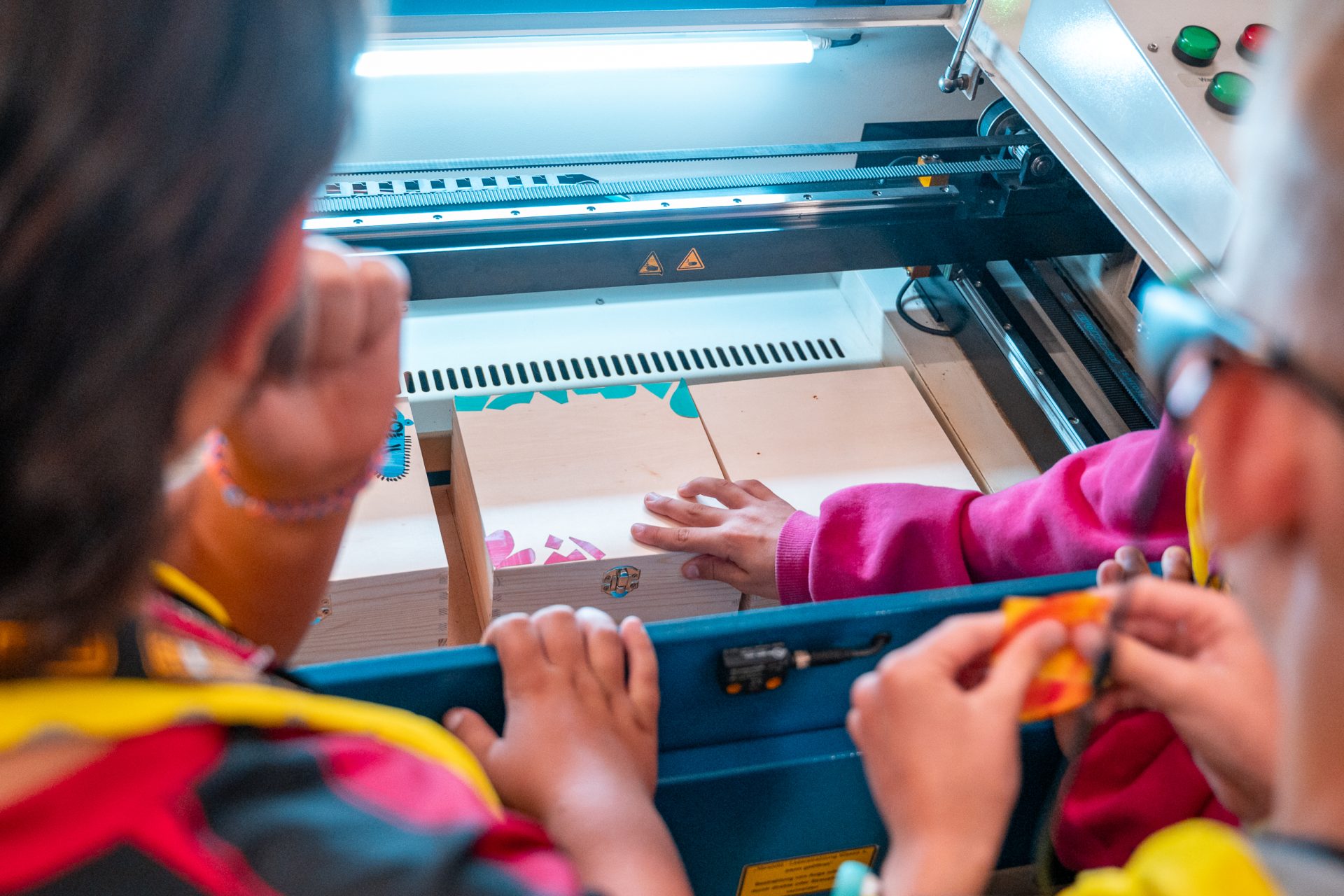 - Design deng Këscht : Dans le Makerspace, ils ont personnalisé leur capsule temporelle et découvert l’utilisation créative du découpage laser et des autocollants faits main.