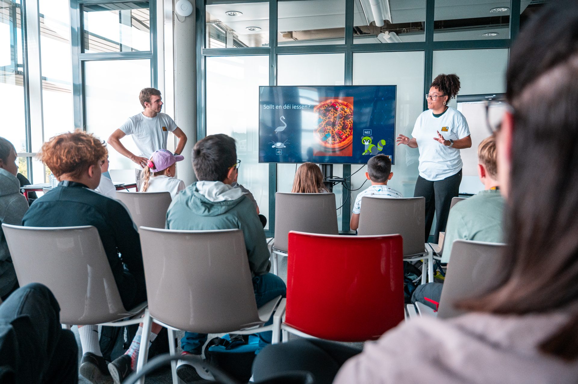 - Kanner schwätzen: Sur un terrain de jeu, les enfants ont répondu à des questions sur le numérique en se plaçant entre des cônes marqués A, B, C ou D. Ils ont ainsi appris des faits essentiels et des liens de compréhension autour du monde numérique.